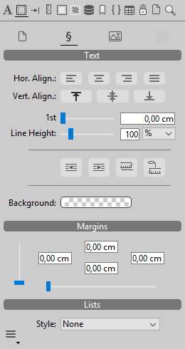 Frames can be set for the document as a whole and/or for individual paragraphs, or for pictures found in the text. You use the icons at the top of the panel to configure these settings separately for the desired area: i.e.,
