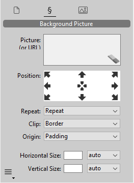 This panel manages background pictures for the 4D Write Pro area. You can drag and drop pictures or URLs directly onto the Picture area. In addition, a right-click in the Picture area displays a drop-down list where several background patterns are available by default. You can set the position and size of each picture or pattern used and define custom settings. You can use the