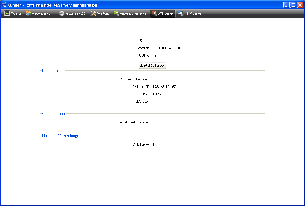 Der obere Teil zeigt Informationen über den aktuellen Status des SQL Server von 4D Server.