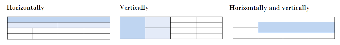 Todos os comandos de tabela existentes são aplicáveis a intervalos ou elementos que contenham células fusionadas. Em uma tabela que contenha células fusionadas, os índices das células permanecem como se não se tivesse combinado nenhuma célula.