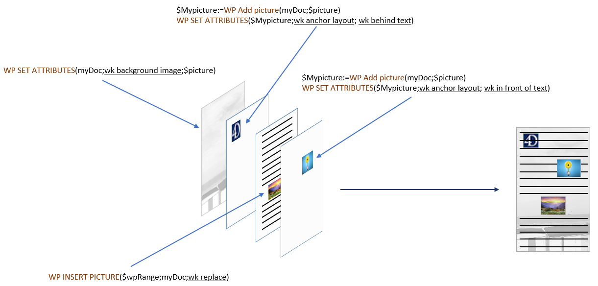 Adding pictures to a 4D Write Pro document can be accomplished in multiple ways and depend on your needs: