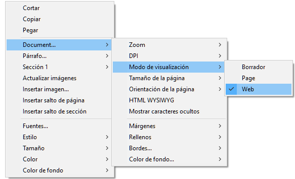 Embebido: modo de vista conveniente para áreas anidadas; no muestra márgenes, pies de página, encabezados, columnas, marcos de página, etc. Este modo también se puede utilizar para producir una salida de vista como Web (si selecciona también la resolución 96 dpi y la opción HTML WYSIWYG).