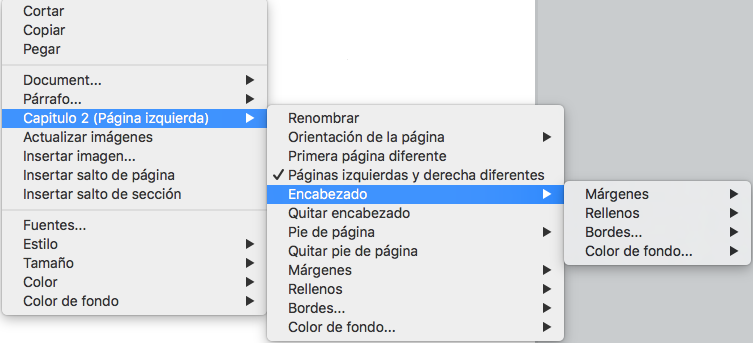 Tenga en cuenta que si se ha definido una primera página diferente o diferentes páginas izquierda/derecha para una sección, el tipo de página también se muestra en el menú (ver abajo).