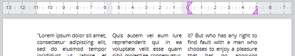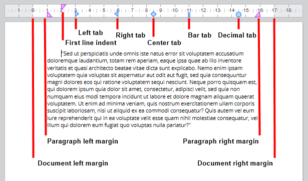 Puede modificar márgenes izquierda y derecha, indentaciones y posiciones de tabulación haciendo clic y arrastrando los símbolos correspondientes en la regla horizontal: