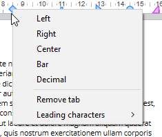 Para crear una tabulación, simplemente haga clic directamente en la regla y elija su tipo en el menú contextual. Un solo clic izquierdo crea automáticamente una tabulación izquierda predeterminada. También puede hacer clic con el botón derecho en las tabulaciones existentes para modificar su tipo utilizando el menú contextual.