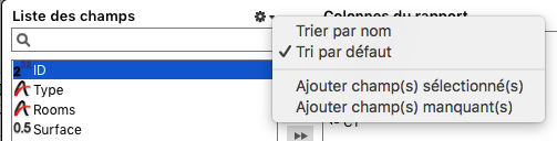 Vous pouvez utiliser le menu action pour trier la Liste des champs, ou ajouter rapidement plusieurs champs de cette liste vers la liste "Colonnes du rapport".