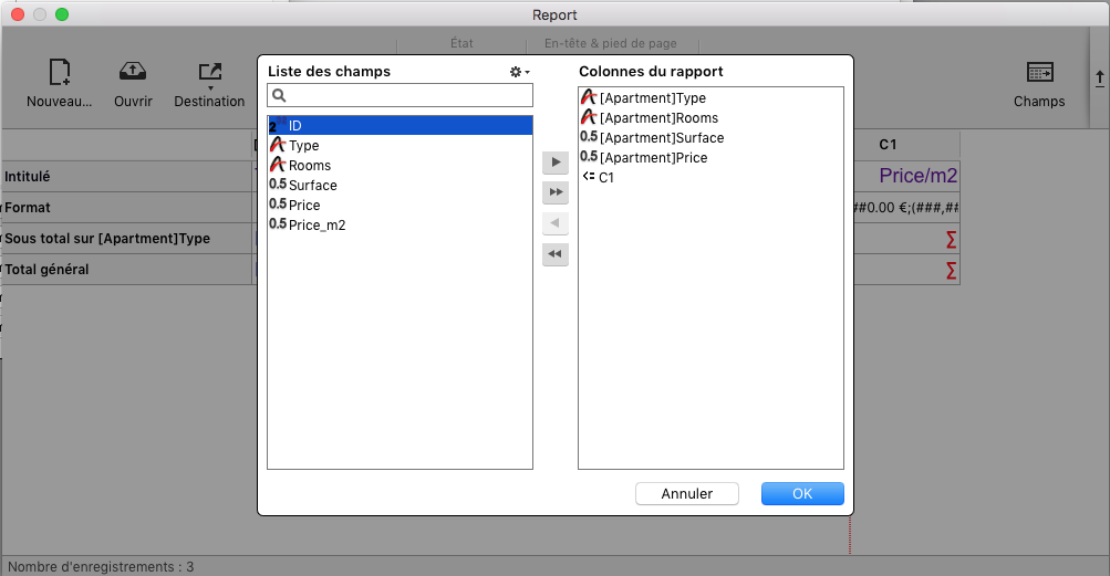 Lorsque vous cliquez sur OK, tous les changements sont automatiquement reportés dans l'état. Par exemple, si vous supprimez ou ajoutez un champ dans la liste "Colonnes du rapport", les colonnes sont aussi supprimées ou ajoutées dans l'état lui-même ; il en est de même si vous changez l'ordre des champs.