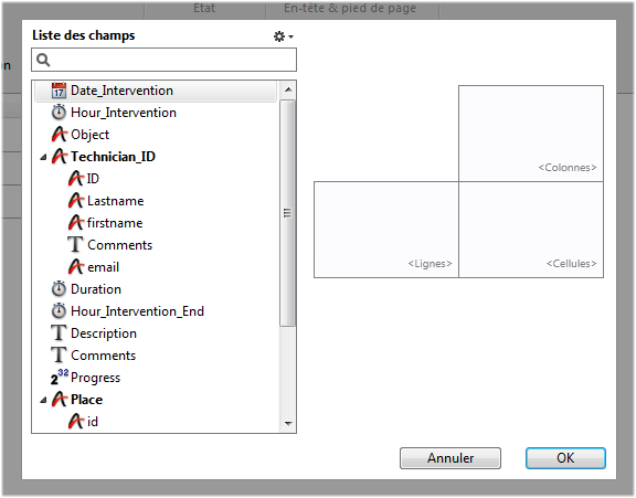 • Liste des champs listant tous les champs de la table courante ainsi que les champs des tables liées.
