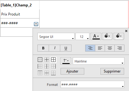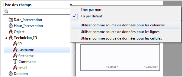 • Sélectionner un élément de la Liste des champs et l'affecter à une cellule de données en choisissant la commande correspondante dans le menu action :