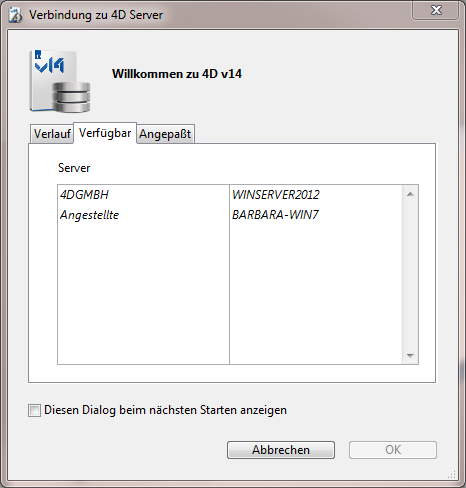 Markieren Sie die Option Diesen Dialog beim nächsten Starten anzeigen, erscheint das Fenster automatisch beim Starten der 4D Anwendung.