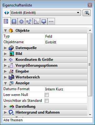 Sie können das Format auch in der Eigenschaftenliste in der Combobox eingeben bzw. ändern. Sie können auch ein eigenes Zahlenformat wählen, das im Format- und Filtereditor der Toolbox definiert wurde. Solch ein Format lässt sich nicht über die Objekteigenschaften ändern. Sie können auf den Editor zugreifen, wenn Sie neben der Combobox auf die Schaltfläche [...] klicken.