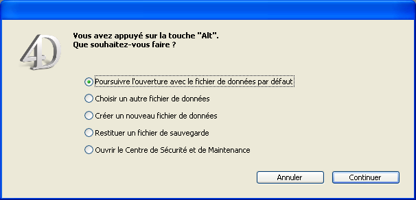 • Pendant le lancement de la base, maintenir enfoncée la touche Alt (sous Windows) ou Option (sous Mac OS). La boîte de dialogue suivante apparaît :