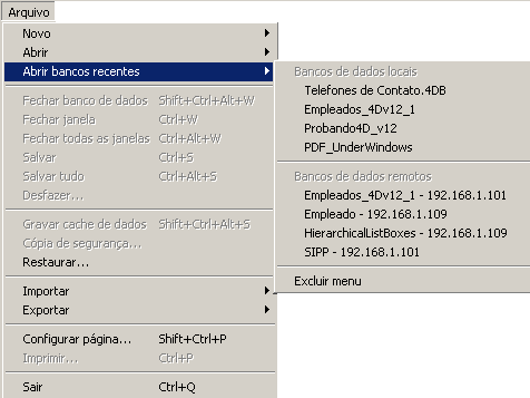 Esse comando se encontra no menu Arquivo do 4D. Se você usar a aplicação 4D para abrir banco de dados locais e conectar-se a banco de dados remotos, esse menu listará os dois tipos de bancos de dados. Os bancos de dados remotos estão disponíveis na parte de baixo do menu: