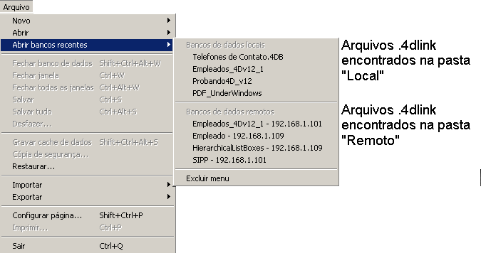 Os arquivos encontrados nesses diretórios são mostrados no submenu Abrir bancos recentes> do menu Arquivo do 4D: