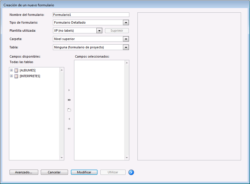 Para mostrar las opciones avanzadas del asistente de formularios, haga clic en el botón Avanzado... en la pantalla básica del asistente. Si quiere regresar a la primera pantalla del asistente de creación de formularios, puede hacerlo haciendo clic en el botón < Anterior.