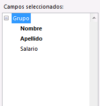 (Opcional) Si es necesario, cree una o más áreas de grupo en la lista de campos seleccionados. Nota: esta función no está disponible para formularios listados. Un área de grupo tiene su propia etiqueta y un conjunto de campos y se ve de esta forma: Para crear un área de grupo, haga clic en el botón de creación de áreas de grupo . En la lista de campos seleccionados aparece un nuevo elemento, llamado “Grupo”, por defecto. Puede renombrarlo si es necesario. Nota: el nombre de un área de grupo es un texto estático; puede utilizar una referencia “localizable” como con las etiquetas 4D (ver Utilizar las referencias en los textos estáticos y ). Puede añadir campos al área de grupo arrastrándolos de la lista campos disponibles y soltándolos en el nuevo elemento. La lista de campos seleccionados toma la apariencia de una lista jerárquica. A medida que se añade un campo al grupo, aparece debajo del nombre del área de grupo. Nota: cuando el elemento del área de grupo se despliega, puede añadir campos por arrastrar y soltar a los campos que ya se encuentran en la lista de campos seleccionados.