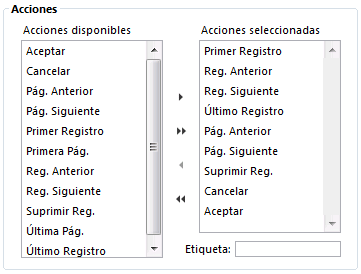 Nota: aún cuando los botones de gestión de páginas (Página anterior, Página siguiente, etc.) estén seleccionados en el área “Acciones seleccionadas”, sólo se incluirán en el formulario si es necesario crear un formulario multipáginas.