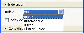 • Type : Type d’index. Chaque type d’index (B-tree, Cluster B-Tree, mots-clés, index composite) est représenté avec une icône différente. Il est possible de modifier le type d’index en cliquant sur le triangle inversé et en sélectionnant une valeur différente dans le pop up menu.