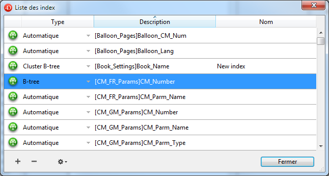 Le bouton de la barre d’outils de l’éditeur de structure fait apparaître la fenêtre de la Liste des index. Cette fenêtre affiche la liste et les propriétés de tous les index de la structure, quel que soit leur type :