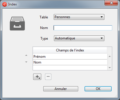 Le bouton   affiche la boîte de dialogue de configuration d’index.