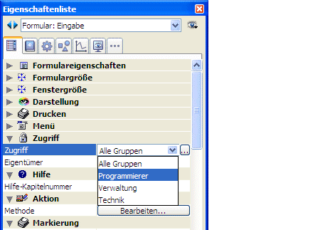 Die Eigenschaftenliste und das Fenster “Formulareigenschaften” zeigen die Listen für Zugriff und Eigentümer: