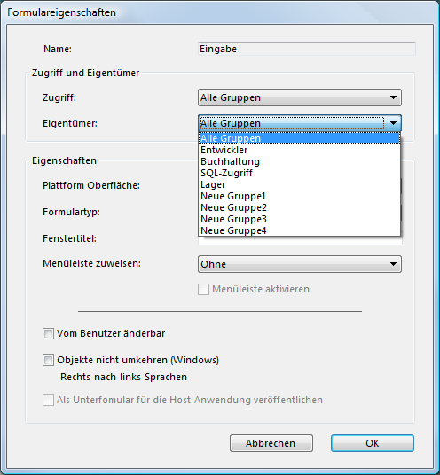 Wenn Sie keine Gruppe auswählen, erhalten alle Gruppen Eigentümerrechte auf das Formular (Standardeinstellung).