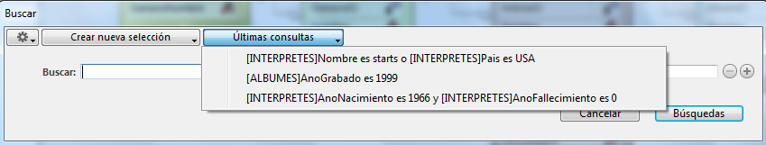 Este menú aparece cuando al menos una búsqueda ha sido realizada. Contiene las últimas consultas realizadas durante la sesión, permitiendo al usuario repetir fácilmente sus consultadas más frecuentes. Se conservan un máximo de 10 consultas.
