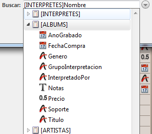 Esta lista muestra todas las tablas y campos de la base. Si una estructura virtual se especifica utilizando los comandos  SET TABLE TITLES y SET FIELD TITLES ésta se tiene en cuenta.