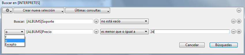 5. Seleccione la conjunción que desea (Y, O, Excepto).