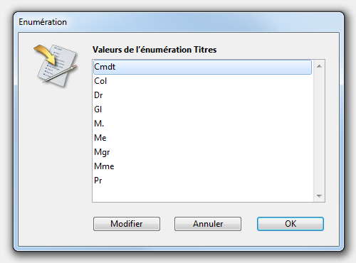 - dans le cas des champs, variables ou colonnes de list box, une énumération de valeurs obligatoires doit également être définie pour l'objet (la même énumération doit être généralement utilisée), de sorte que seules des valeurs appartenant à l'énumération pourront être saisies par l'utilisateur.