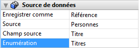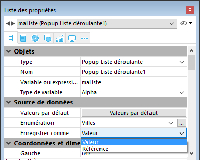 L'option Enregistrer comme Valeur/Référence est disponible dans le thème "Sources de données" pour les objets de type Champs et variables objets, les Pop-ups/Listes déroulantes ainsi que les colonnes de list box (cf. Propriétés spécifiques des colonnes de List box :