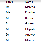 Vous souhaitez utiliser un champ "Titre" pour caractériser des personnes : M., Mme, mais aussi Dr, Mgr, Me, etc. Pour cela, vous créez un champ "Titre" de type entier long. Vous définissez une liste de choix (nommée "Titres") contenant tous les titres possibles, et vous l’associez au champ.