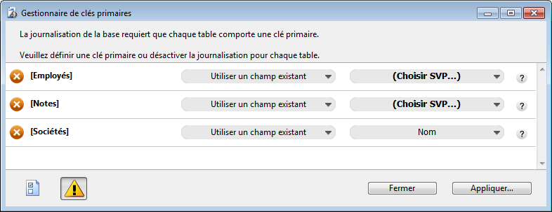 ![]() | Clé manquante, champ(s) éligible(s) | La table ne contient pas de clé primaire et elle contient au moins un champ pouvant devenir la clé primaire |