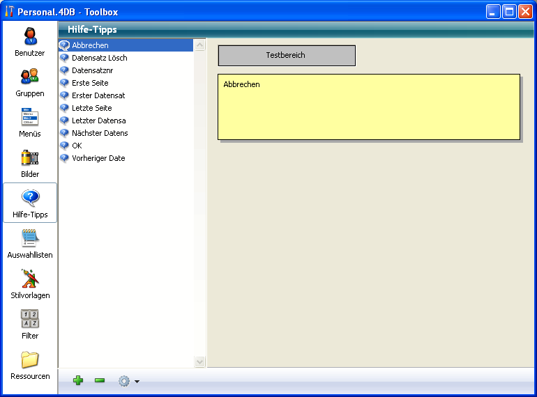 Auf diese Weise können Sie sehen, wie der Hilfetipp in der Datenbank erscheint. - Wollen Sie einen neuen Hilfetext erstellen, klicken Sie am unteren Rand auf das Pluszeichen