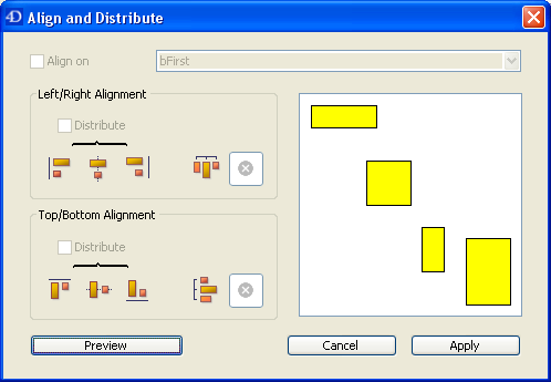 To perform a distribution that uses the standard scheme, click Preview or Apply. In this case 4D will perform a standard distribution, so that the objects are set out with an equal amount of space between them. OR: To execute a specific distribution, select the Distribute option (for example if you want to distribute the objects based on the distance to their right side). This option acts like a switch. If the Distribute check box is selected, the icons located below it perform a different function: