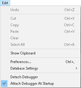 El menú Edición también incluye los comandos Desprender depurador y Adjuntar depurador al inicio, lo que permite controlar la depuración del código: