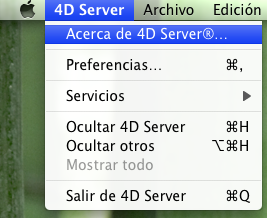 La interfaz de la aplicación 4D Server se compone de los siguientes menús: Archivo, Edición, Ventana, Ayuda. Bajo Mac OS, algunos comandos se encuentran en el menú 4D Server (menú aplicación).