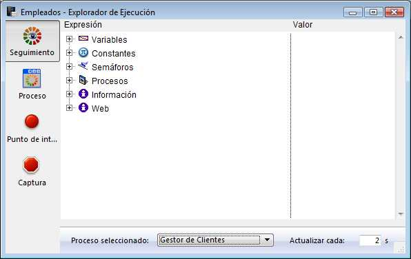 La ventana contiene cuatro páginas, accesibles vía los botones correspondientes: Seguimiento, Proceso, Punto de interrupción y Captura. El funcionamiento del Explorador de ejecución en 4D Server es idéntico al de 4D. Para mayor información, consulte el manual de Diseño.