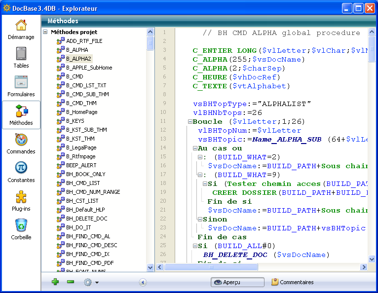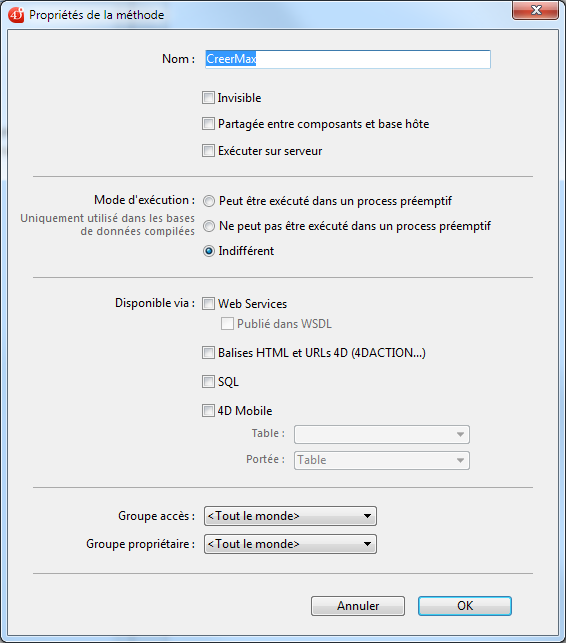 Méthodes composant : Cette catégorie est affichée si des composants comportant des méthodes partagées ont été installés dans la base. Elle contient la liste les composants installés et leurs méthodes partagées. Ce point est décrit dans le paragraphe .