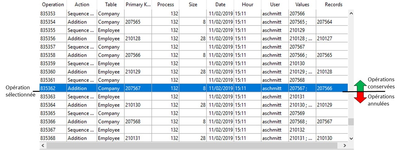 Pour effectuer un retour en arrière parmi les opérations, vous devez sélectionner la ligne située après laquelle toutes les opérations doivent être annulées. L’opération de la ligne sélectionnée sera la dernière conservée. Si par exemple vous souhaitez annuler une suppression, sélectionnez l’opération située juste avant la suppression. L'opération de suppression et les opérations suivantes seront annulées.