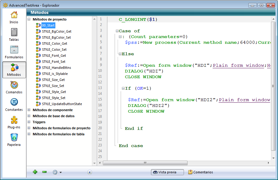 La página Métodos muestra las listas de métodos de proyecto, métodos base, métodos formulario tabla, métodos formularios proyecto y triggers de la base de datos. Los tipos de métodos se agrupan por categorías.