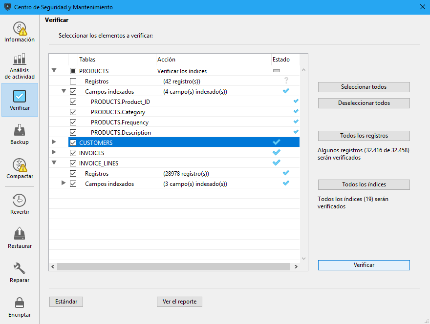 • La verificación de los registros e índices también puede efectuarse en modo detallado, tabla por tabla (ver la sección “Detalles”).