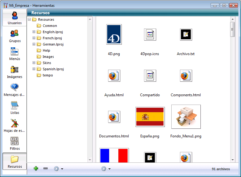 El explorador de recursos muestra el contenido de la carpeta Resources de la base actual como una lista jerárquica. También incluye varias funciones adicionales que facilitan la administración del contenido de la carpeta: adición y supresión de elementos, previsualización, etc.