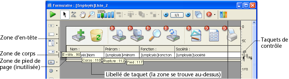 Dans un formulaire listant des enregistrements à l’écran, les zones d’en-tête et de pied de page peuvent contenir divers objets cliquables et non saisissables tels que des boutons, des boutons radio, des listes hiérarchiques, etc. Pour plus d’informations sur ce point, reportez-vous au paragraphe suivant, consacré aux taquets.