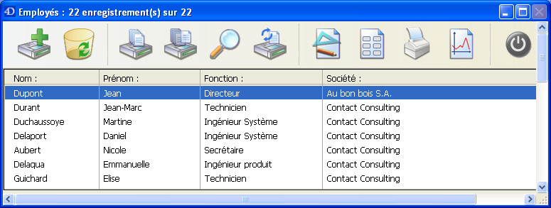 Lorsque vous créez un formulaire Liste à l’aide de l’assistant de création de formulaires, il crée automatiquement ces zones. Il place le titre du formulaire (le nom de la table), les noms des champs ainsi que des boutons de contrôle dans la zone d’en-tête (le contenu exact de la zone d’En-tête dépend des options que vous avez sélectionnées dans l’assistant de création de formulaires). Les champs que vous sélectionnez sont chacun placés dans une ligne de la zone de corps. Une petite zone de rupture est créée mais l’assistant ne place rien dedans.