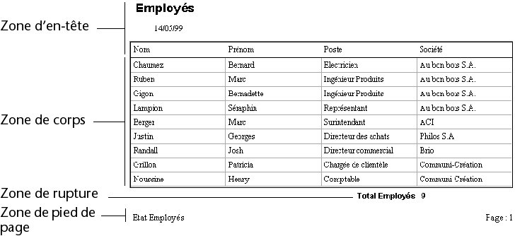 Dans un état imprimé, une zone d’en-tête contient généralement la date, l’heure, un titre courant ainsi que des intitulés de colonnes. Les enregistrements apparaissent dans la zone de corps. Un total calculé sera généralement placé dans la zone de rupture. La zone de pied de page contient le numéro de page.