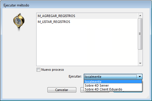 Puede hacer lo mismo con 4D Server, en un equipo cliente. Además, utilizando el comando Execute on server en el equipo servidor, puede iniciar un proceso de usuario en el cual ejecutar un método. Además, utilizando el comando EXECUTE ON CLIENT, puede correr un método en otro proceso en un cliente diferente. En ambos casos, el método se llama un procedimiento almacenado y por extensión, el proceso iniciado en el equipo servidor u otro equipo cliente también llamado procedimiento almacenado.