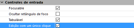 unselectablebooleanInstitui a linha correspondente como não sendo selecionável (ou seja, highlight não é possível). Áreas digitáveis não são mais digitáveis se essa opção estiver ativa a não ser que a opção "Single-Click Edit" também esteja ativa. Controles tais como checkboxes e listas continuam funcionando. Essa configuração é ignorada se o modo de seleção de list box estiver marcado como  "None". Valor padrão: False.