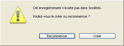 Confirmation de création : Si cette option est cochée, 4D affiche une fenêtre qui permet à l’utilisateur de créer l’enregistrement parent s’il n’existe pas. Par défaut, lorsque vous saisissez une valeur dans un champ lié de la table N, 4D vérifie si un enregistrement parent existe déjà dans la table liée. Si 4D n’en trouve pas, la boîte de dialogue suivante apparaît : Cette boîte de dialogue vous permet de créer un enregistrement correspondant dans la table 1, pendant que vous procédez à la saisie dans la table N. Par exemple, supposez que votre base contienne une table [Factures] et une table [Clients]. Si vous saisissez une facture dans la table [Factures] et que le client auquel elle est destinée n’a pas encore d’enregistrement dans la table [Clients], 4D vous demandera dans ce cas si vous souhaitez créer l’enregistrement correspondant dans la table [Clients] lors de la validation de l’enregistrement de la table [Factures]. Vous pouvez supprimer cette boîte de dialogue en désélectionnant l’option Confirmation de création. Supprimer cette boîte de dialogue est utile lorsque vous souhaitez gérer la création d’un enregistrement parent à l’aide de méthodes.