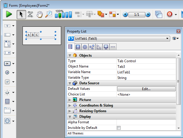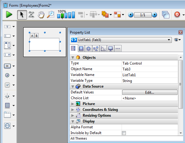 Adds a tab object whose contents can come from an array or a hierarchical list. You can use the Property list to modify its properties.